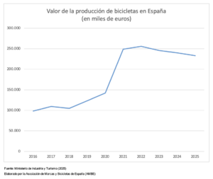 La producción de bicicletas en España alcanzó las 286.100 unidades en 2025 y un valor de producción de 233,1 millones de euros, según los datos oficiales publicados por el Ministerio de Industria y Turismo.